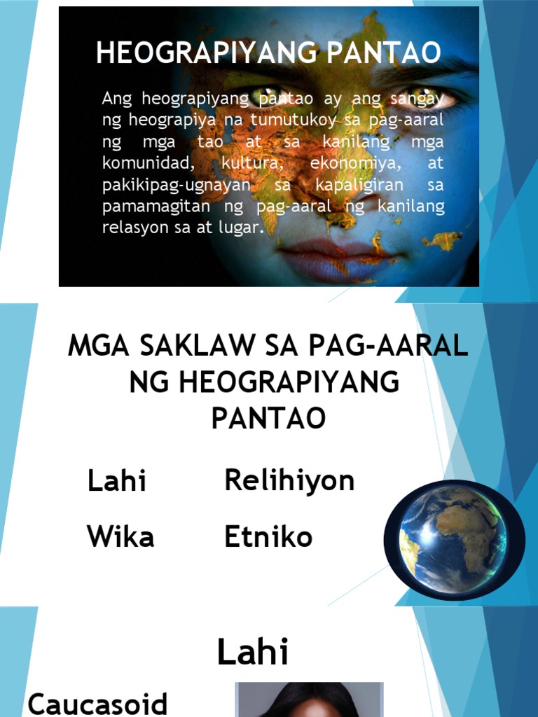 Bay Grade VIII- Fe del Mundo References. Ang heograpiyang pantao Ingles. Human GeographyHEOGRAPIYANG PANTAOIto ay pag-aaral ng wika relihiyon lahi at pangkat-etniko sa ibat ibang bahagi ng daigdig-kaluluwa ng isang kulturaWIKAkalipunan ng mga paniniwala at rituwal ng isang pangkat ng mga taong tungkol sa isang kinikilalang makapangyarihang nilalang o DiyosRELIHIYONNagmula ito sa salitang religare na.