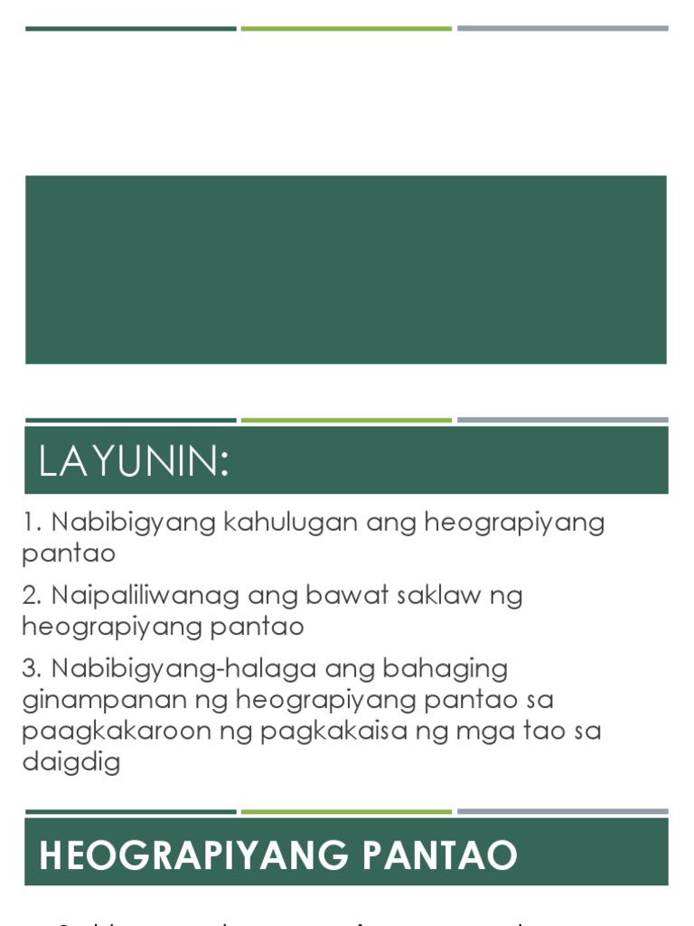 Pantao Saklaw ng Heograpiyang pantao. Heograpiyang Pantao - Free download as Powerpoint Presentation ppt pptx PDF File pdf or view presentation slides online. Ito ay ang pag-aaral ng pisikal na katangian ng daigdig.