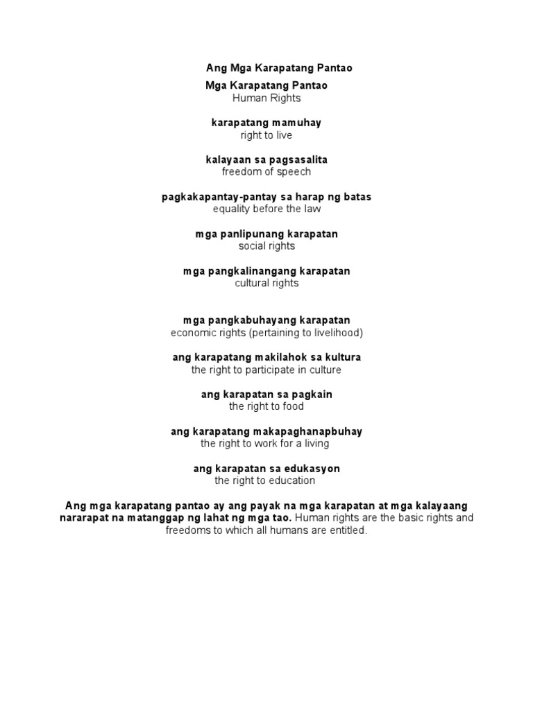 Displaying all worksheets related to - Karapatang Pantao. The Philippine Bill of Rights is in Article III of the 1987 Constitution. Maipaliwanag ang konsepto ng karapatang pantao at ang mga batayan nito.