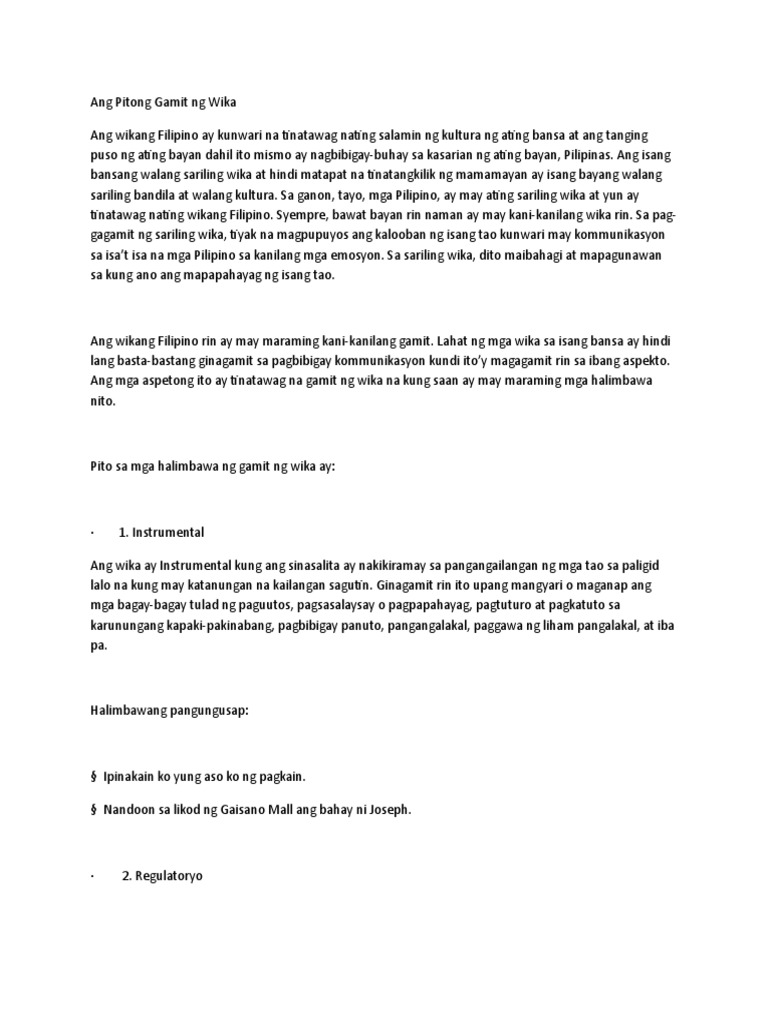 Ang Pitong Gamit ng Wika Ang wikang Filipino ay kunwari na tinatawag nating salamin ng kultura ng ating bansa at ang tanging puso ng ating bayan dahil ito mismo ay nagbibigay-buhay sa kasarian ng ating bayan Pilipinas. Komunikasyon11 Q1 M5 Ibat Ibang Gamit Ng Wika Sa Lipunan. Aralin 5 Gamit ng Wika sa Lipunan Gamit ng Wika sa Lipunan Michael Halliday Michael Halliday Inilahad ni Halliday 1973 sa kaniya.