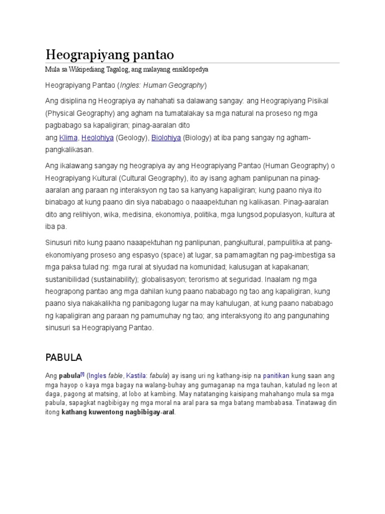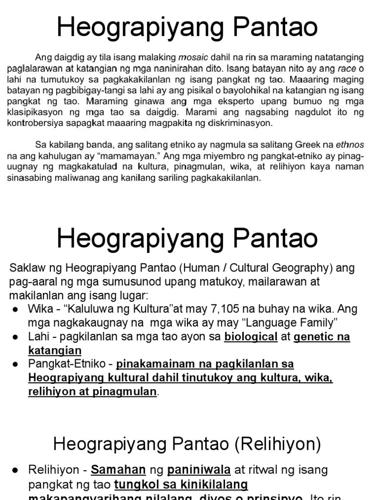Ano Ang Ibig Sabihin Ng Salita Ng Heograpiyang Pantao. Ang human geography o anthropogeography ay ang sangay ng heograpiya na nakikipag-usap sa mga tao at kanilang mga pamayanan kultura ekonomiya at pakikipag-ugnayan sa kapaligiran sa pamamagitan ng pag-aaral ng kanilang mga relasyon sa at sa mga lokasyon. Mga Aralin at Sakop ng Modyul Heograpiya ng Daigdig Ang mga Sinaunang Tao Ang mga Sinaunang Kabihasnan 3.