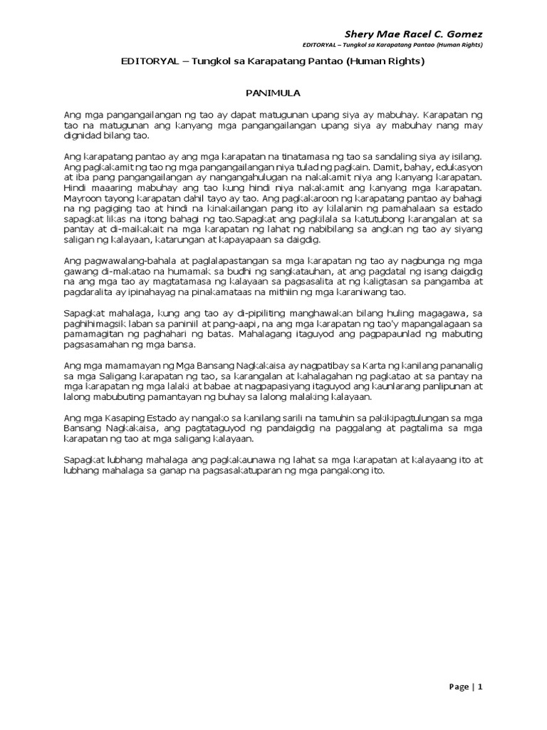 Karapatang pantao editoryal. 10022018 Bill of Rights 1791 Ito ang nagbigay-proteksiyon sa mga karapatang pantao ng lahat ng mamamayan at maging ang iba pang taong nanirahan sa bansa. Layunin ng editoryal na mahikayat ang mambabasa na igalang at pahalagahan ang. Pilipinas ang Commission on Human Rights CHR ang may pangunahing tungkulin na pangalagaan ang mga karapatang pantao ng mga mamamayan.