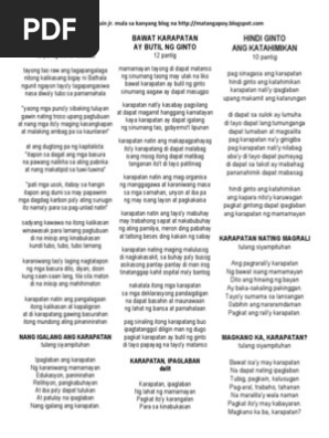 Karapatan Lahat tayo ay may karapatan at pantay-pantay tayo sa lahat ng aspeto. Ang tulang Tayo Lahat ay isang tula na nagpapaliwanag na tayo ay pare-pareho lamang ng karapatan sa mundo. Home Keywords tula tungkol sa karapatang pantao.